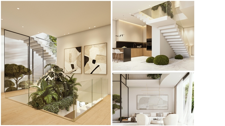 Vibrant stage for contemporary family life wellness, movement, and community. Living garden at the heart of the home. Architectural promenade through light. Home sculpted from glass and sunlight.